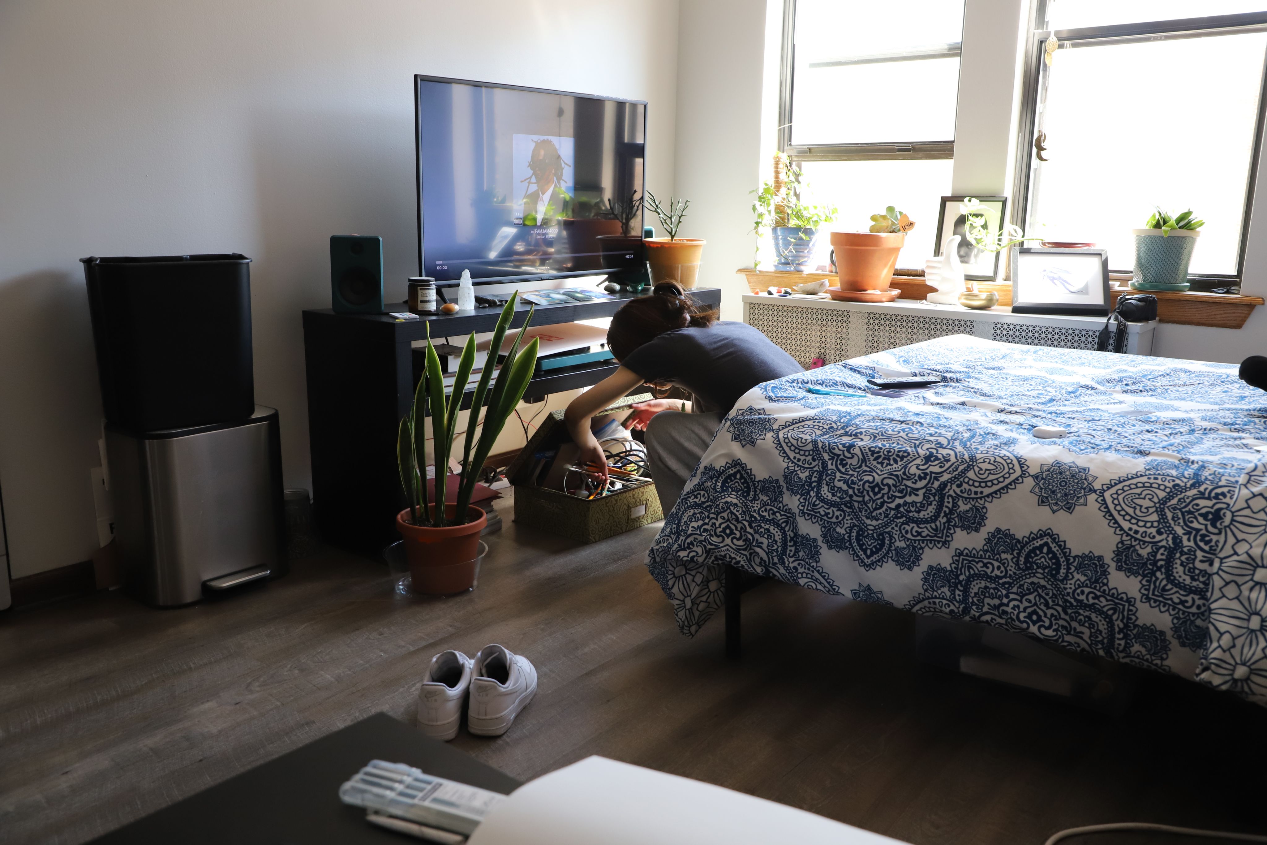Kentay Varnell sifts through art supplies in her Chicago apartment on April 20, 2024. (By Aubreonna Chamberlain)